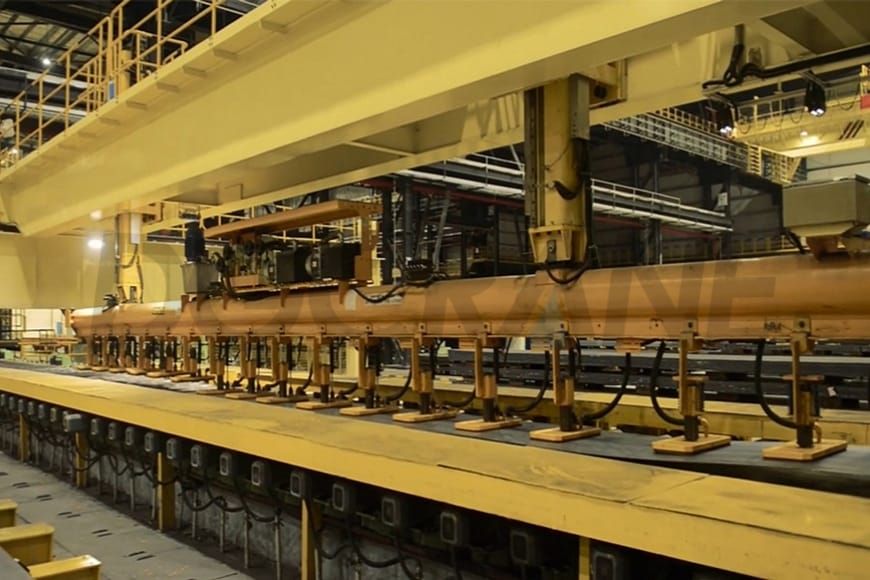 Automated steel plate handling overhead cranes are indispensable material handling equipment in the continuous casting and rolling process of metals, mainly used for transporting finished products and steel plates in storage areas or warehouses. This type of crane operates in a high-speed production environment and requires a reliable and continuous power supply to ensure smooth and precise material handling.