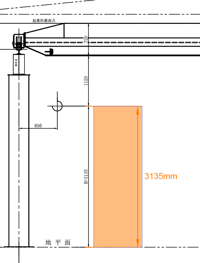 | Výška zdvihu jednonosníkového jeřábu EOT je 3135 mm. |