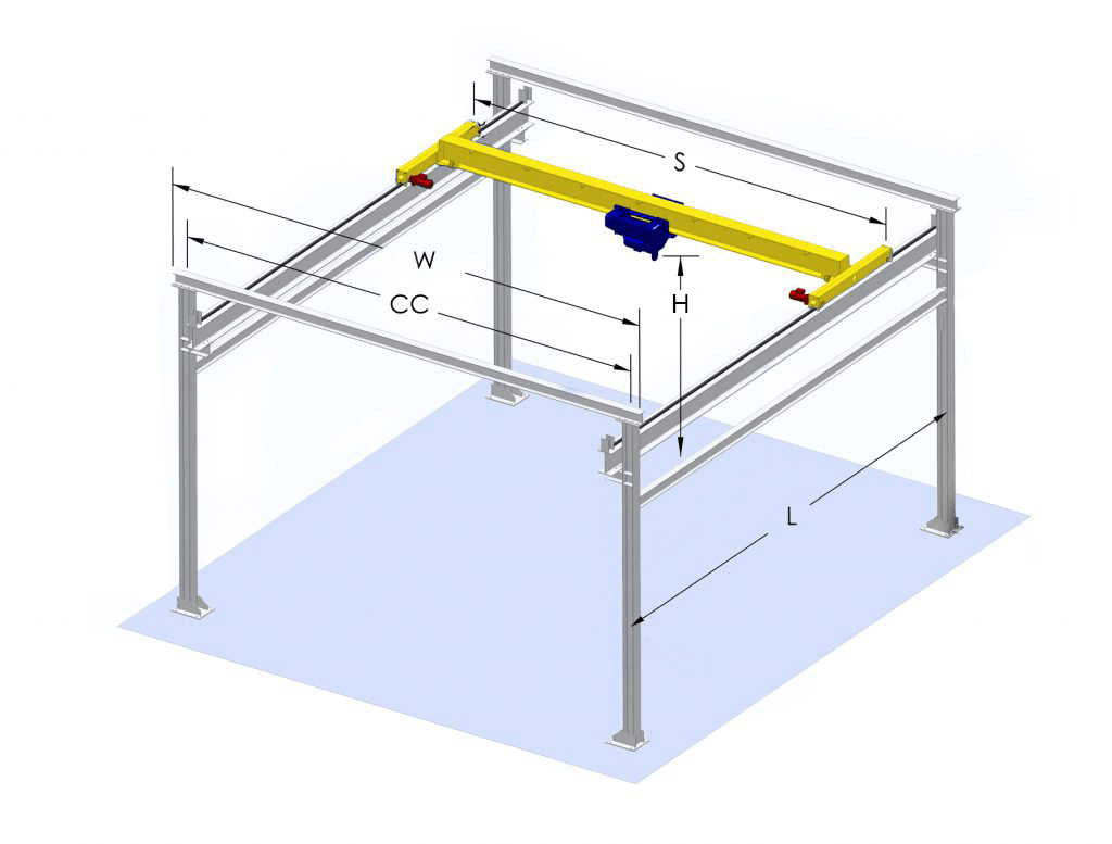 - Rozpětí (S): Vzdálenost mezi středovými polohami dvou drah jeřábové dráhy určuje rozpětí. Rozpětí ve spojení s výběrem typu mostového jeřábu s jedním nosníkem určuje levou a pravou krajní polohu pro zdvih.