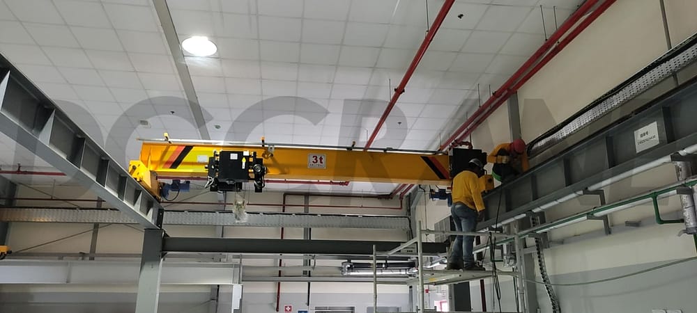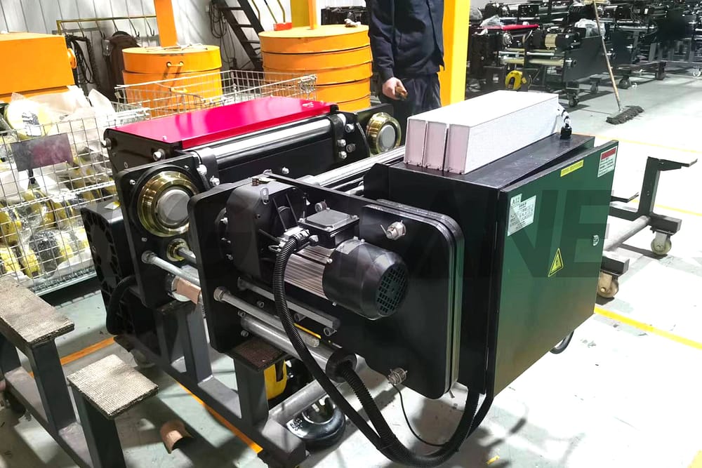 - Dispositivo di sollevamento: il dispositivo di sollevamento è responsabile del sollevamento e dell'abbassamento dei carichi, come un paranco. È fissato al ponte e si sposta lungo di esso, consentendo un posizionamento preciso dei carichi.