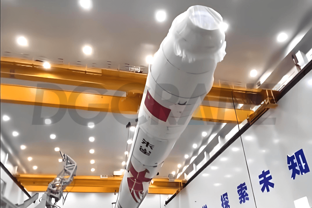 Двобалковий мостовий кран FEM відіграє вирішальну роль у транспортуванні та підйомі ракет, точно виконуючи такі завдання, як переміщення всередині заводу, переміщення, поворот, перевірка, випробування та заправка паливом. Наша незалежно розроблена електрична система автоматичного позиціонування та мікрорухів із захистом від хитавиць забезпечує високоточне підйом та транспортування ракет.