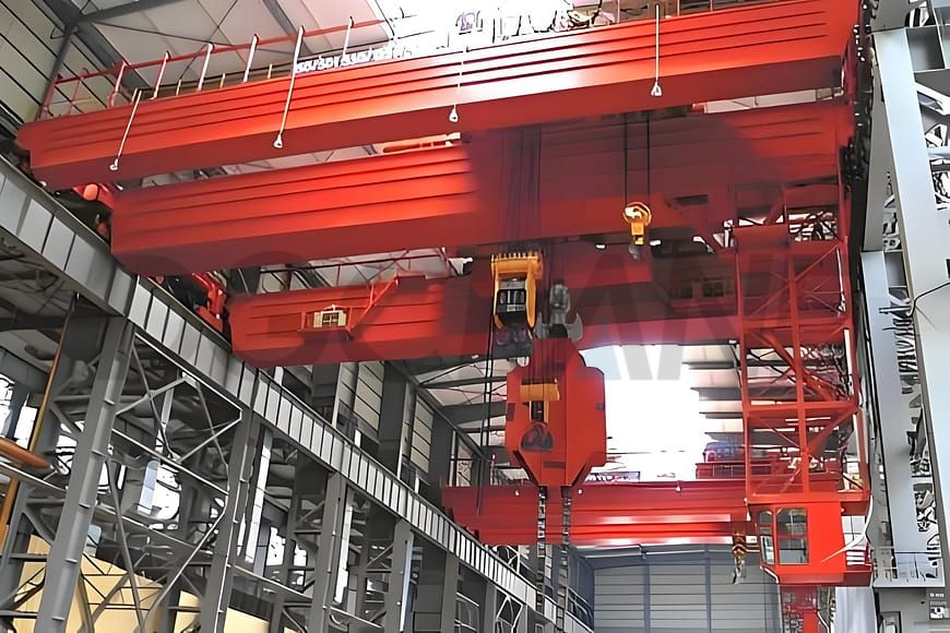 锻造起重机通常有两种结构配置:双梁双轨道单吊和三梁四轨道双吊。结构与锻造车间布局和液压机定位紧密相关。