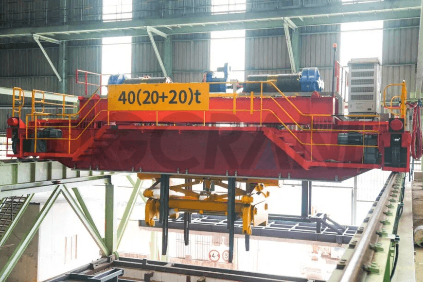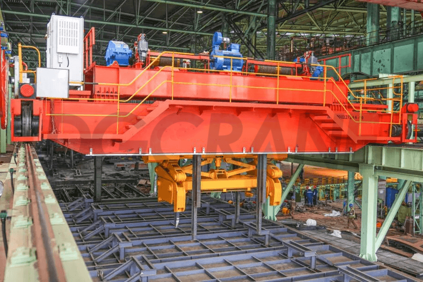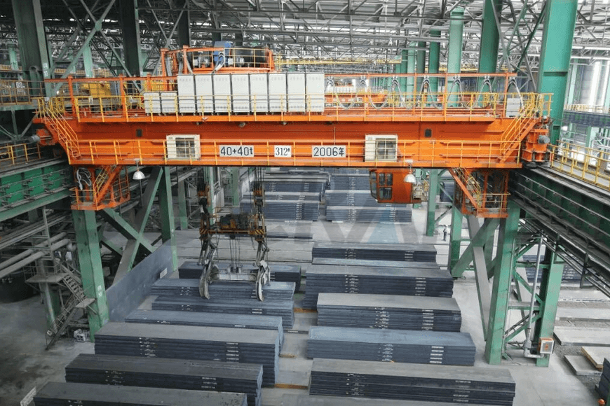 - 连铸车间:在连铸车间,这种类型的桥式起重机负责将热板坯从连铸机出料辊台运送到板坯缓冲区。它需要精确抓取温度高达 600–1200 °C 的高温连铸板坯,并将其提升到板坯冷却区或直接运送到热轧机。